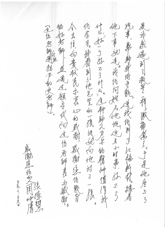 3月4日,学院院长洪霄收到苏州市民周仲清、张德慧夫妇写来的一封表扬信。两位老人在信中回顾了春节期间来常探亲,因城市变化太大以致迷路时,得到我校招生就业处史京军老师热情相助的前后经过,对史老师做好事不留名的“雷锋”式善行表示了衷心感谢,对学校培育出高素质教师予以盛赞。