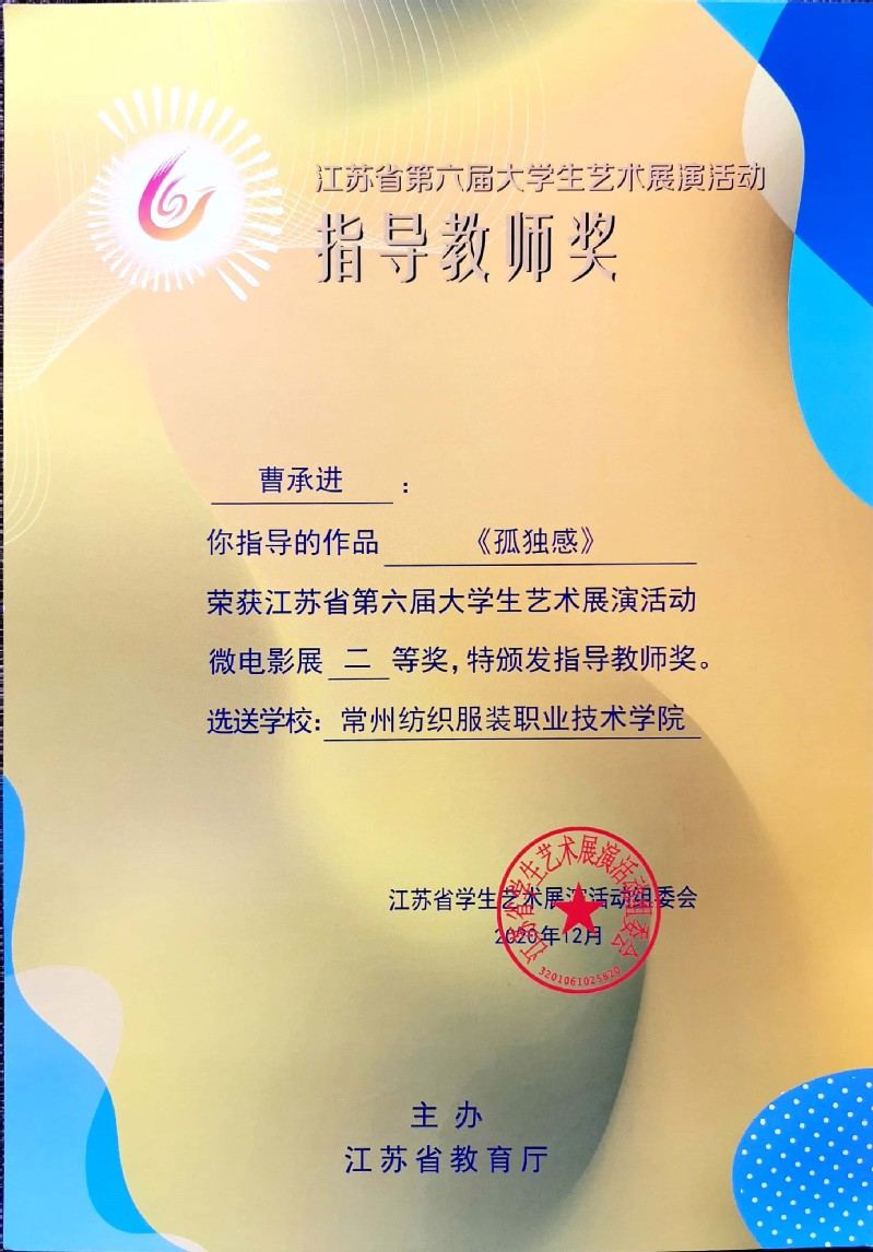 积极带领学生参与各类的专业大赛,为学生的就业打下良好的基础。在第四届国际大学生新媒体节中,带领国际学院学生雅酷巴拍摄制作视频短片《青果巷》,在众多本科院校和兄弟院校同台比拼作为唯一的高职院校获得二等奖;在江苏省第六届大学生艺术展演活动微电影展中,指导学生创作微电影《孤独感》获得二等奖,获得优秀指导教师奖;江苏省第六届大学生艺术展演活动大学生艺术实践工作坊展评二等奖,获得优秀指导教师奖。引导和鼓励学生参与各类大赛,以大赛促进专业技能,提升学生的专业自豪感。