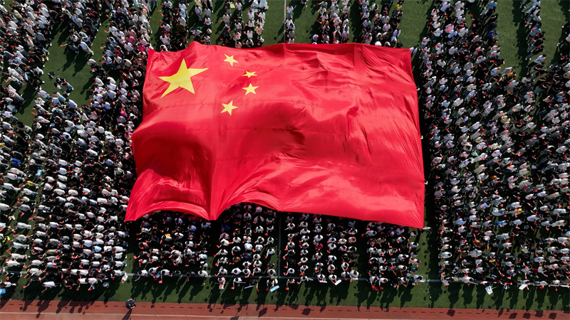 宣誓完毕,典礼现场迎来最令人心潮澎湃的时刻。蓝天白云之下,一面巨幅国旗由国旗班学子稳稳托起,沿着操场缓缓从新生头顶掠过;五千余名新生挥动手中的小国旗,鲜红的旗帜在风中汇成一片海洋,与巨幅国旗交相辉映。随后,全场师生齐声高唱《歌唱祖国》,真挚的情感、洪亮的歌声回荡在校园上空,既是对祖国的深情礼赞,也是对英雄的深切缅怀,更凝聚起全体常纺人砥砺前行的磅礴力量。