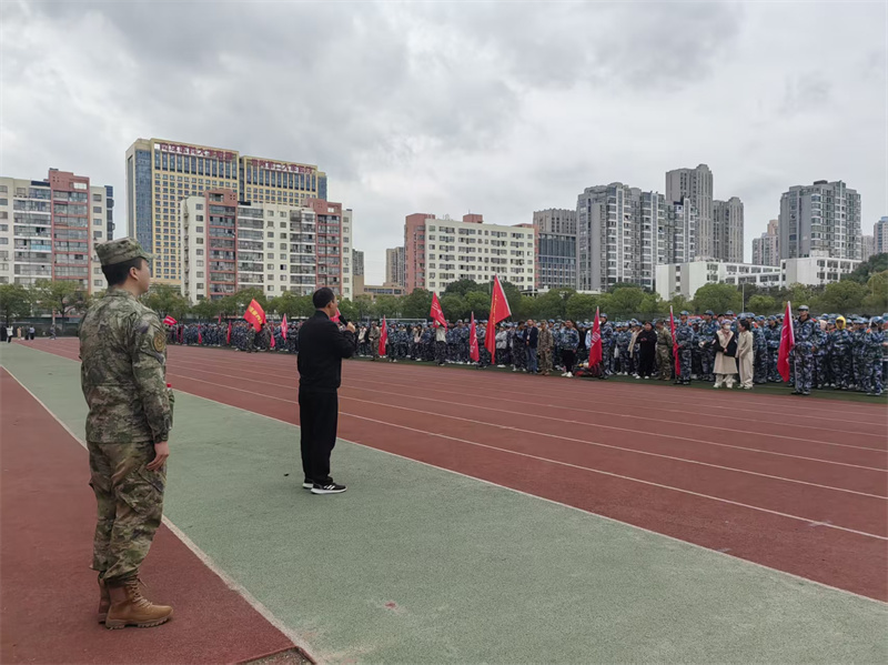 14:30,出征仪式在学校足球场举行。中国人民解放军95469部队李旺参谋在动员讲话中谈到,徒步拉练是军训过程中的重要实践环节,既是对身体素质的检验,更是对精神意志与组织纪律性的深度锤炼。他鼓励同学们珍惜集体行动的机会,发扬团结拼搏、不畏困难的优良作风,在拉练中互帮互助、共同进步。