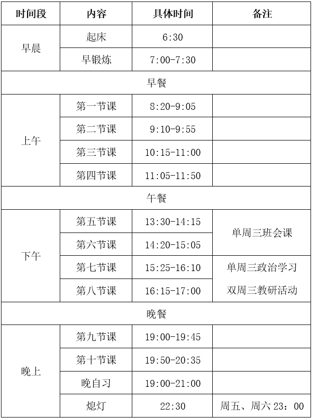 3.调整后学校作息时间表,详见附件《学校作息时间安排表》,更新内容为:每单周三下午五六节课为班会课,单周三七八节课为政治学习,双周三七八节课为教研活动。